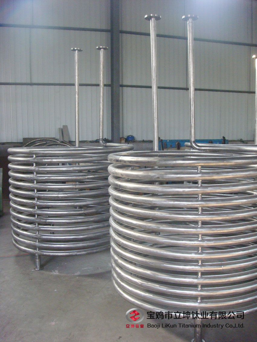 鈦冷凝器-鈦螺旋管冷凝器、鈦U型管冷凝器-采用優質鈦材加工而成,廣泛用于含氯離子、稀硫酸、稀鹽酸、硝酸等各種酸堿環境下。冷水機鈦冷卻管選用優質TA2工業純鈦制作,鈦的純度達99.7%,耐腐蝕性強,適用于低濃度酸性液體加熱與冷卻;采用自動焊接技術,焊口結合緊密,牢固,不漏水。